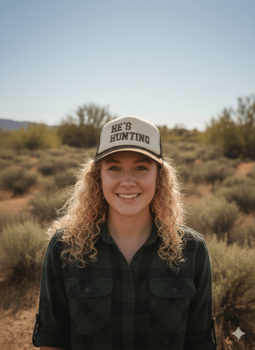 Claim your seat in the great outdoors without saying a word—this hat does the talkin'. Featuring “He’s Hunting” boldly printed across the front of a classic structured trucker silhouette, it's perfect for the wife, girlfriend, or partner holding down the fort while he’s out in the woods.