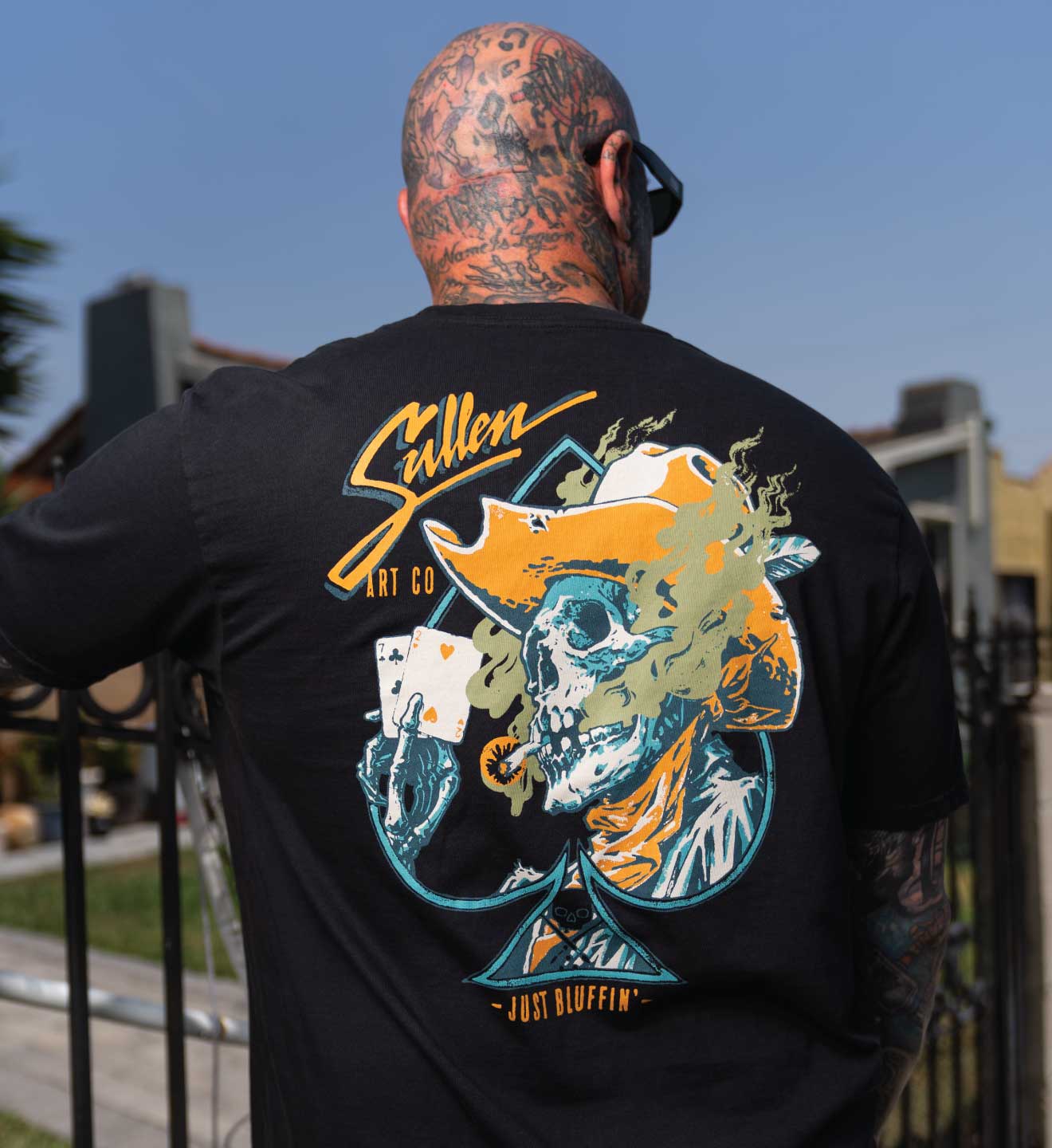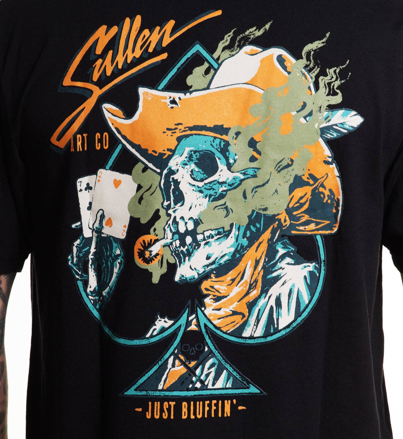 Just Bluffin’ deals a smoke-rolled cowboy skull inside a spade—cards up, seven-deuce flashing—the hand you only win when you bluff. Southwest turquoise and desert-orange hits over jet black. A piece from our Annual Wild West Coast capsule, printed on our premium tee for a soft feel and an easy, everyday fit.
