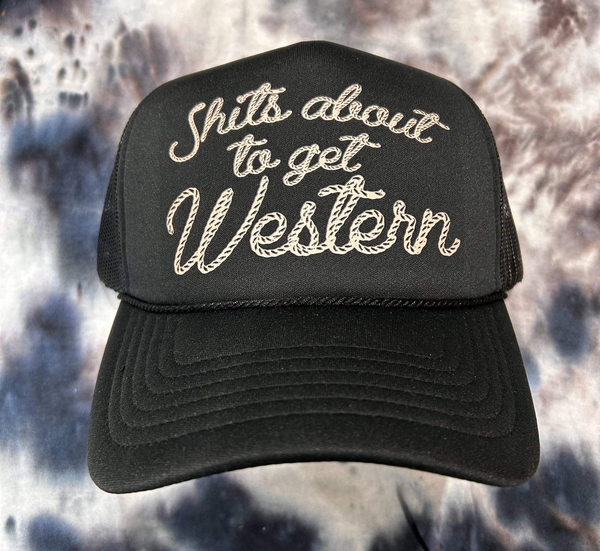 Shits About to Get Western design printed onto your favorite foam trucker hat. Foam truckers have a foam front, mesh back, and adjustable snapback enclosure.